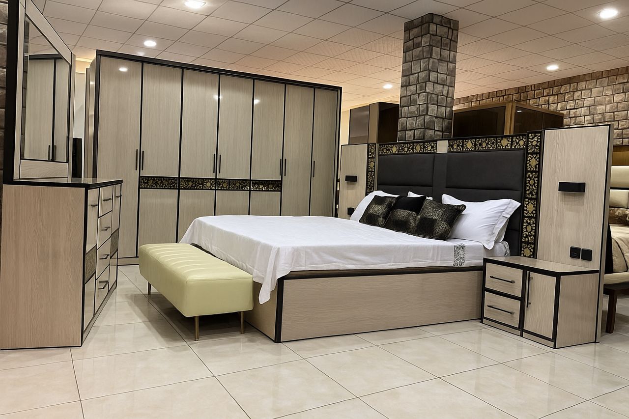 - Le Lit Central : La pièce maîtresse est un magnifique cadre de lit doté d’une imposante tête de lit combinant panneaux de bois, rembourrage en simili-cuir noir pour un confort optimal en position assise, et un bandeau décoratif aux motifs géométriques ajourés.